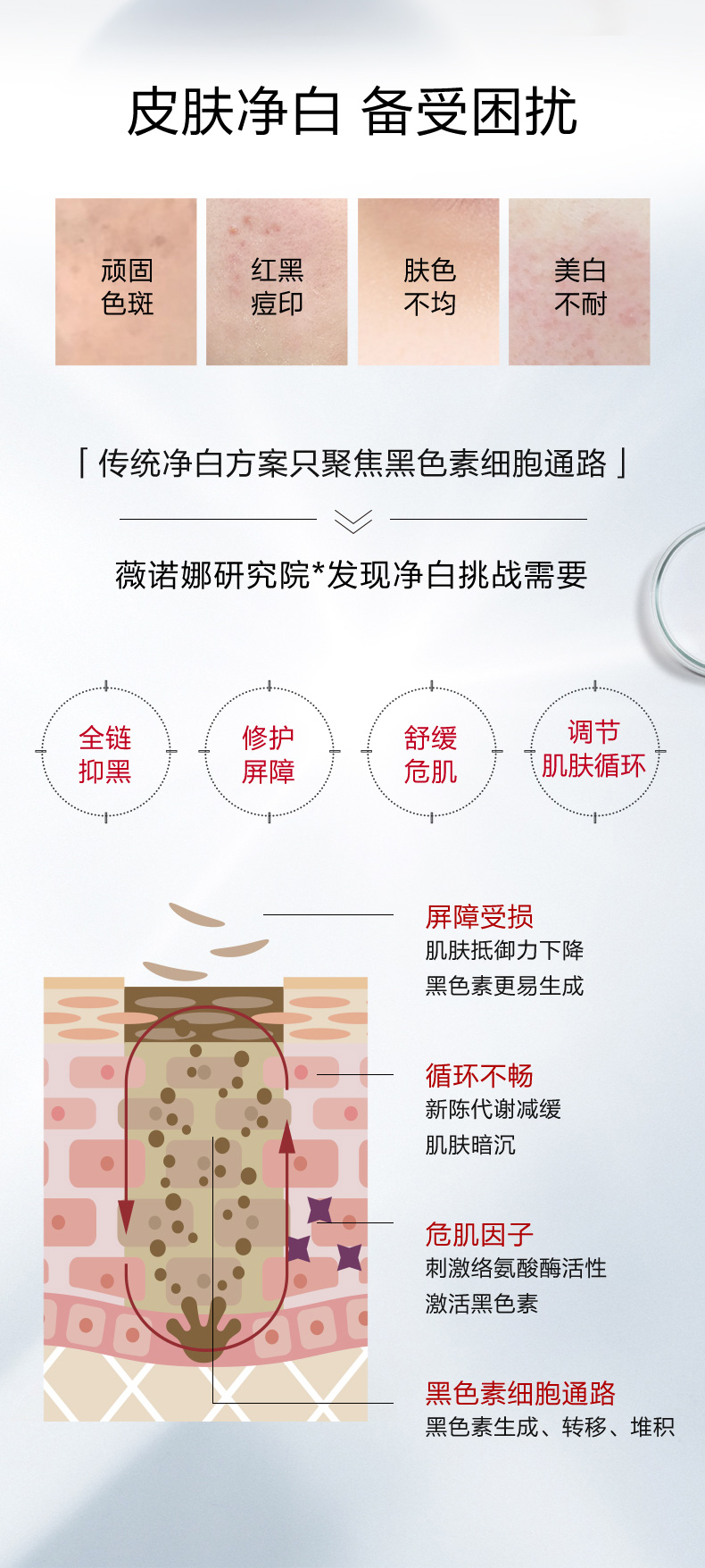 3、针对性强:针对肌肤的不同问题,提供个性化的解决方案,如局部淡化色斑、整体提亮肤色等。