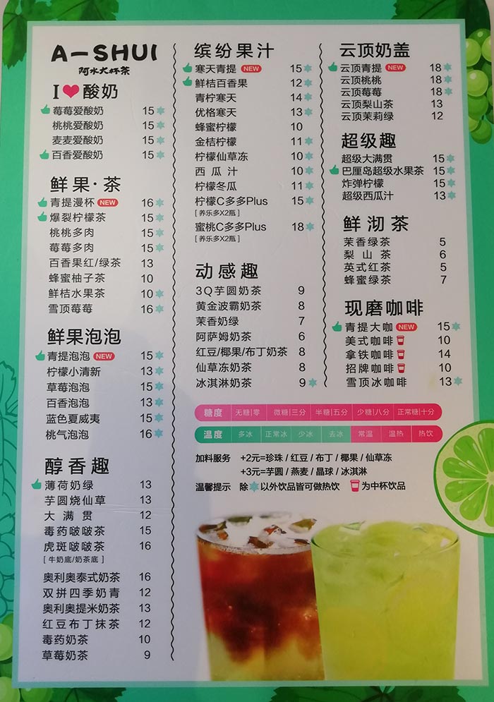 当你看到阿水大杯茶的最新菜单时,不妨尝试一下其中的新品,也许你会发现,那一杯新的茶饮,不仅带给你味蕾上的享受,更带给你心灵上的鼓舞和力量,让我们在品尝美味的同时,也品味生活的美好和变化带来的自信与成就感。