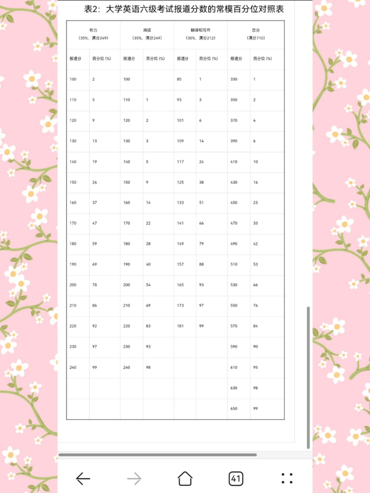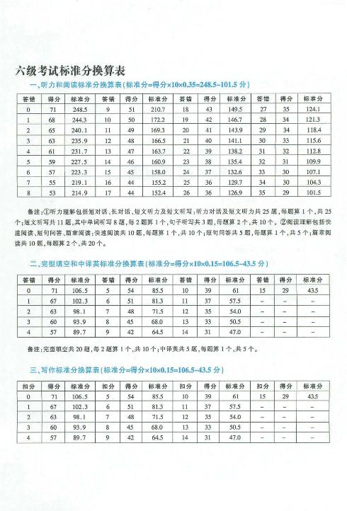 1、分数换算细节:六级考试的分数换算是一个相对复杂的过程,需要结合题目的难易程度及考生的整体表现来进行换算,四个部分的换算分按照一定的比例进行加权计算,得出最后的总分。