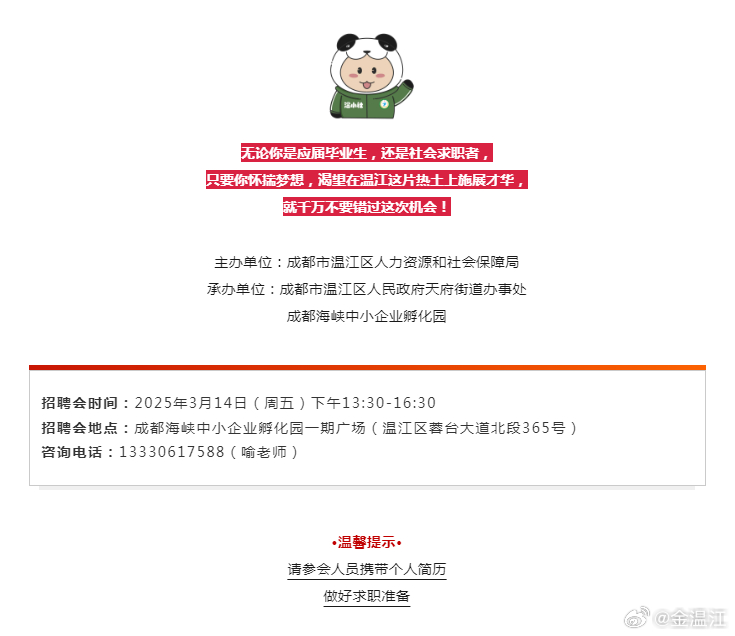 为进一步优化人才结构,温江区政府出台了一系列人才政策,从创业扶持、住房保障、子女教育等方面给予人才全方位的支持,这些政策的实施,吸引了众多优秀人才前来温江发展,为企业的招聘活动提供了有力的支持。